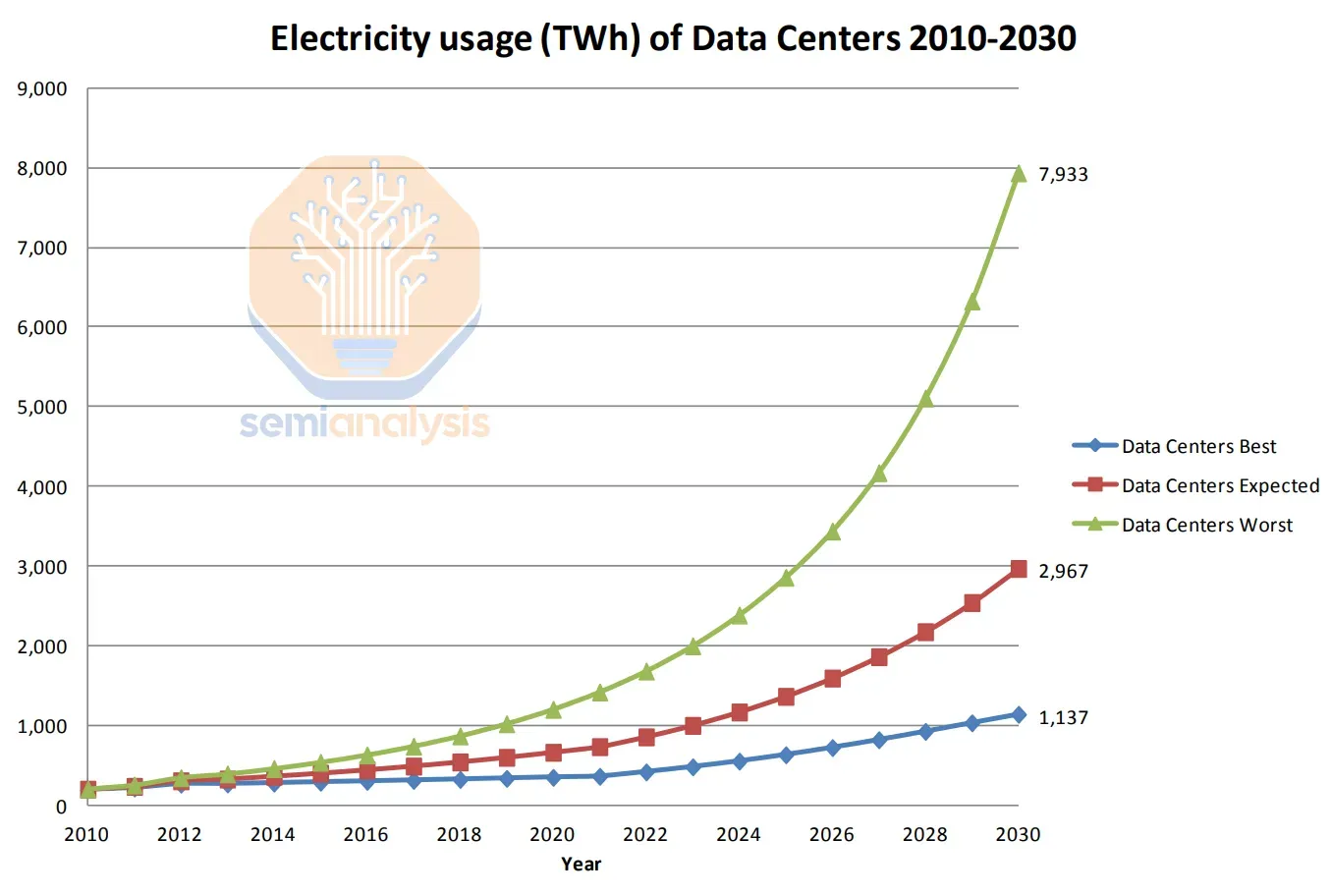 Algunos análisis apuntan que en 2030 los centros de datos para IA consumirán el 4,5% de la energía global generada. El consumo de los centros de datos pasará de 49 GW en 2023 a 96 GW en 2026, de los cuales 40GW será para IA. Este mismo análisis también apunta que Europa estará atada de manos por la realidad geopolítica y las restricciones regulatorias estructurales sobre energía.