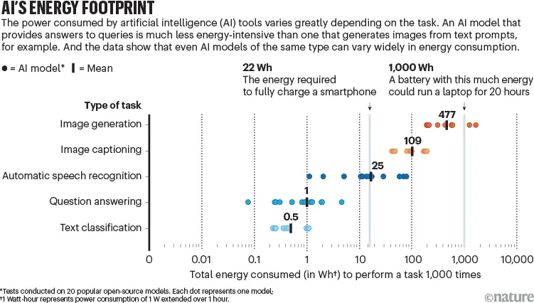 Estudios recientes señalan que, si la tendencia no cambia, la IA podría estar en camino de consumir anualmente tanta electricidad como todo el país de Irlanda (29,3 Tera vatios-hora por año). Este alto consumo, además, comporta la generación de CO2. Por ejemplo, el entrenamiento de Llama 3.12 en sus tres versiones (8B, 70B y 405B) ha generado 11390 toneladas de CO2.